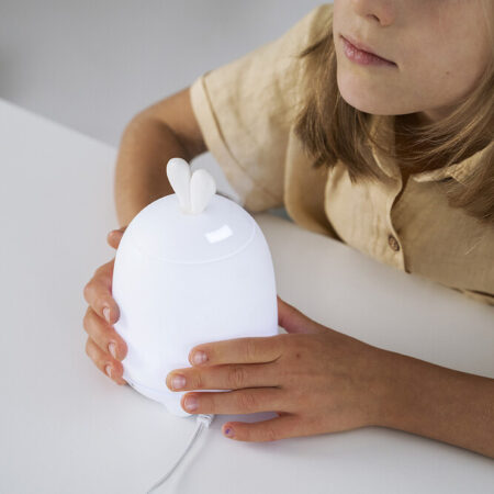 „Rabbit & Friends“ eterinių aliejų difuzorius su mielomis triušio ausytėmis suteikia oro drėgmės ir aromaterapijos naudą. Jis drėkina orą vaikų kambaryje švelniu, vėsiu ir saugiu garu bei padeda sukurti ramią, jaukią aplinką. Spalvas keičiantis LED apšvietimas užtikrina patogų naudojimą naktį, o prietaisas padeda vaikui ramiai ir sveikai miegoti.