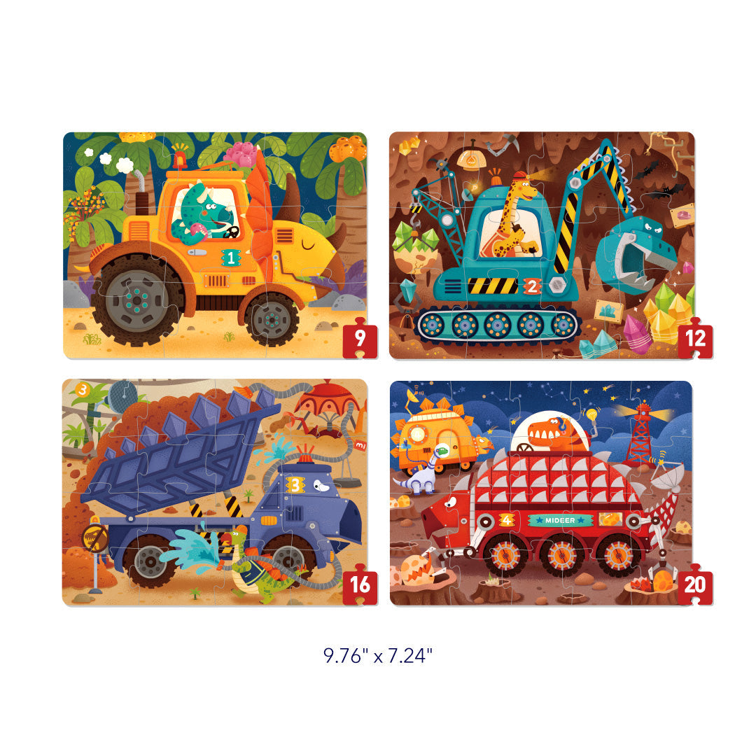 Level Up dėlionės – tai kelionė per 8 skirtingus įgūdžių lygius! Detalės gausėja, kad atitiktų augančią vaiko nuovoką ir smalsumą. Paveikslėlių kelionė prasideda su žaviais gyvūnėliais ir pereina prie nuostabių panoramų! Žadinkite vaiko vaizduotę skirtingais meno stiliais, o lygios dėlionių briaunos leis saugiai žaisti ir mokytis. O kas gi slepiasi „Dinozaurų projektai” rinkinyje? Net 4 dėlionės su dinozaurais, statančiais ir kuriančiais miškuose, urvuose, lygumose, o gal net kitoje planetoje!”