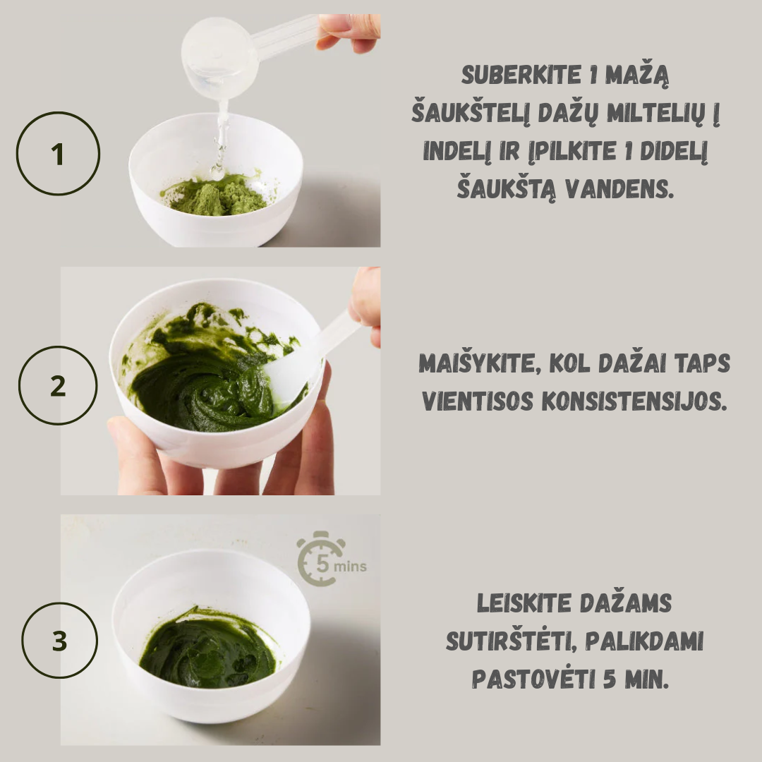 Naudojimas: Į dubenėlį įdėkite vieną mažą šaukštelį dažų miltelių. Užpilkite miltelius vienu dideliu šaukštu vandens. Gerai išmaišykite ir palikite pastovėti 5 minutes.