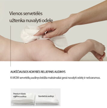 K-MOM servetėlių audinys leidžia maksimaliai gerai nuvalyti odelę ir nešvarumus.