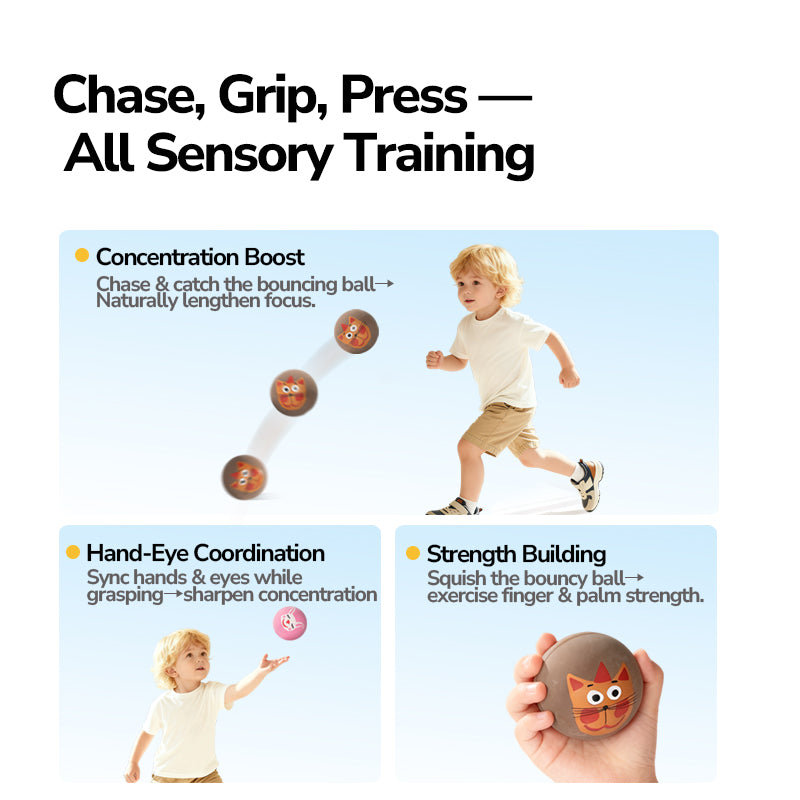 Šie netikėtai šokinėjantys sensoriniai kamuoliukai paverčia aktyvų žaidimą smagiu lavinamuoju užsiėmimu. Unikalus atšokimas skatina vaikus judėti, gaudyti ir tyrinėti judesį, o minkšta tekstūra leidžia saugiai spausti ir laikyti rankose. Puikiai tinka energijai išlieti tiek namuose, tiek lauke.