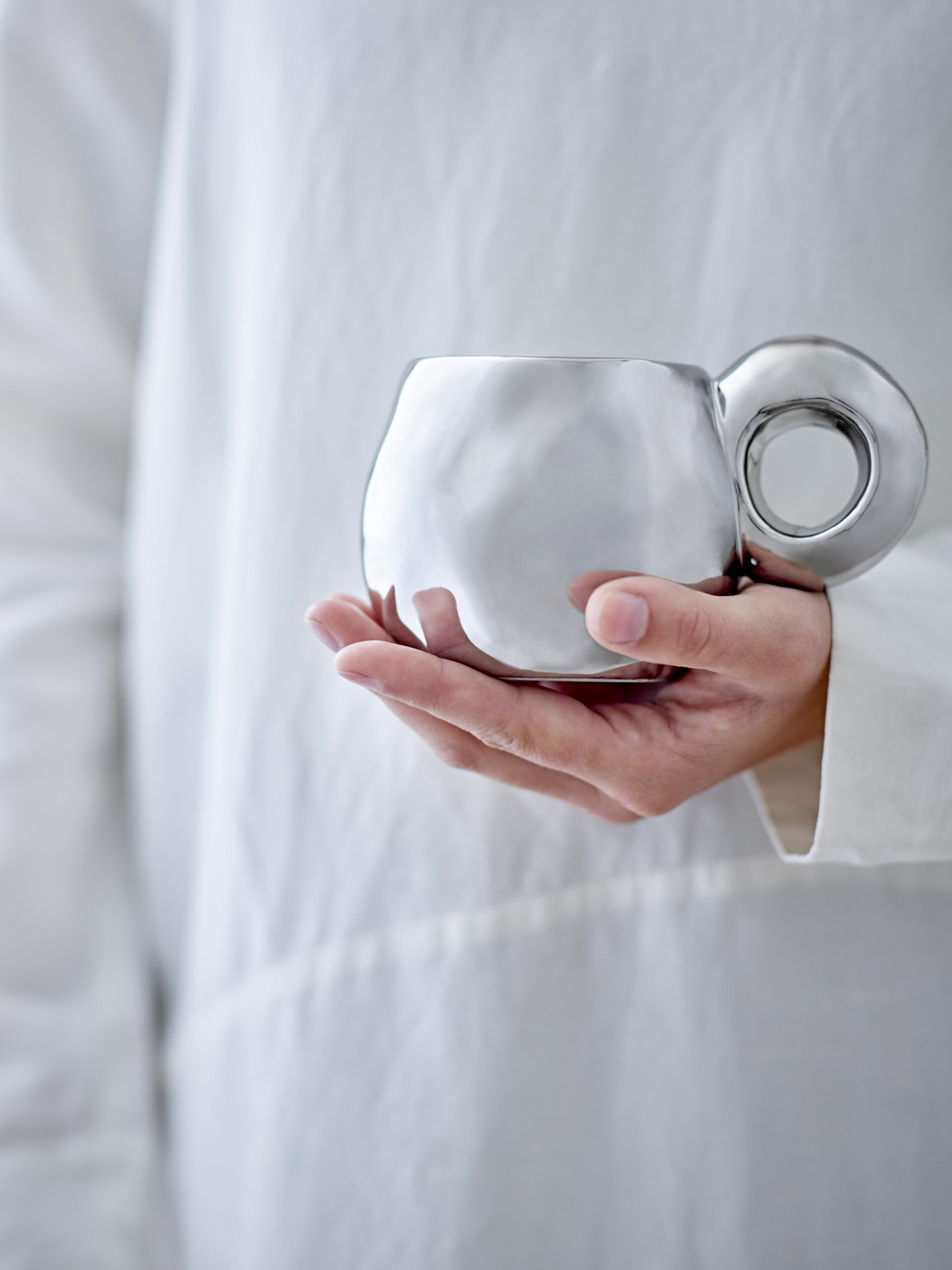 Shine – tai puodelis, kuris spindi ne tik žvilgesiu, bet ir charakteriu. Jo chromuotas paviršius sukuria modernų, blizgų įspūdį, o apvalus skulptūriškas ąselis tampa ne tik funkcija, bet ir tikru dizaino akcentu.